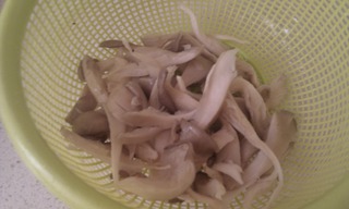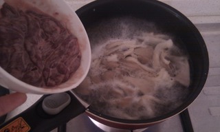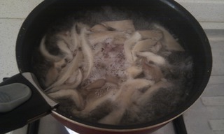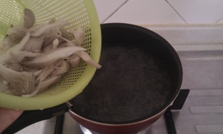 4 锅中加放烧开,倒入平菇,煮至沸腾。