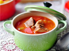 酸中带甜、甜中飘香、肥而不腻、鲜滑爽口的罗宋汤,大量使用番茄酱为主要调味料,搭配各色蔬菜,加上大块儿牛肉,配上一片主食面包,营养丰富,味香醇厚