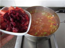 21 同时下入西红柿丁和红菜头丁,搅拌均匀,继续小火慢煮;