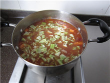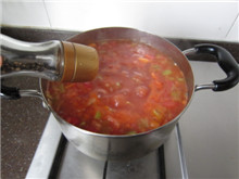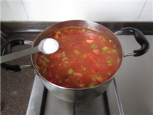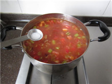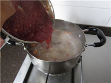 19 将炒好的番茄酱加入汤锅,搅拌均匀,继续小火慢煮;