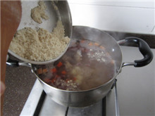 17 将炒好的面粉下入汤锅,搅拌均匀,继续小火慢煮煮;