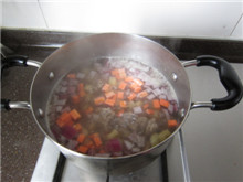 14 下入芹菜丁、土豆丁、胡萝卜丁和洋葱丁,小火慢炖至土豆熟烂;