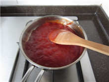 18 小炒锅中加入剩下的黄油和番茄酱,小火慢慢煸炒,至番茄酱呈深棕红色;
