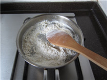 16 待黄油即将完全融化时,下入面粉,小火慢炒至面粉微微发黄;