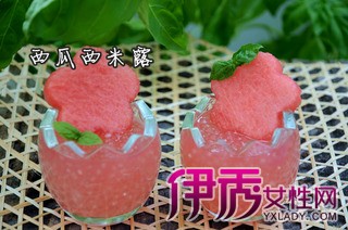 西瓜可清热解暑,除烦止渴:西瓜中含有大量的水分,在急性热病发烧、口渴汗多、烦躁时,吃上一块又甜又沙、水分十足的西瓜,症状会马上改善。而西瓜除了大快朵颐,也可以吃得很精致。加了西米的这款凉品,口感Q 滑弹糯,清凉甜爽,夏日里很受欢迎