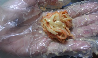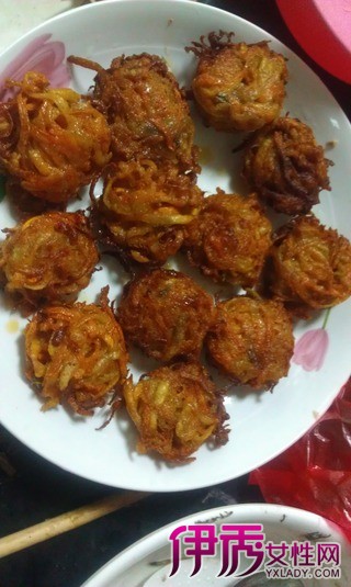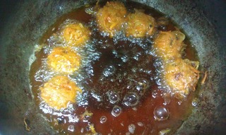 7 开始热油吧,油能没过丸子最好。边热边包丸子吧。(我是和我们家吃货一起包的,增加感情又有人帮手。)对了,这丸子吧包起来想圆圆的就用手掌揉,想吃起来有边上脆脆的丝的感觉就用手指头揉