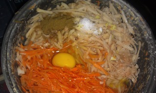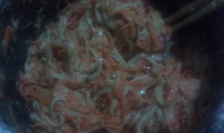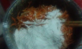 3 加入一勺盐巴一勺鸡精,一个鸡蛋,一些些糖(也可以不加,因为红萝卜本来就是甜的啦)