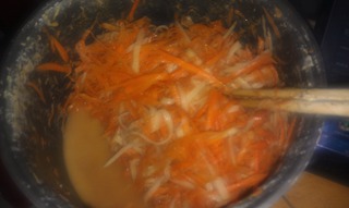 5 加入面粉,最好是红萝卜,土豆和面粉的比例是3:1,大概就是加完面粉搅完后没有水了