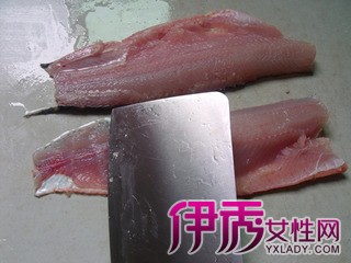 4 鱼肉洗净,刀倾斜着片掉鱼骨和鱼腩,剩下净鱼肉,