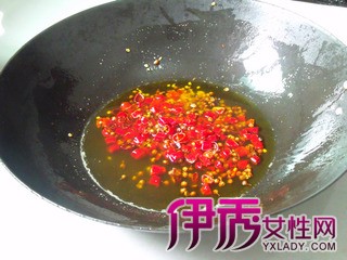 15 锅里放油,凉油的时候就放入花椒和辣椒圈,小火烧,注意看辣椒,变得红中微黄且油亮干酥。注意观察别熬过火了。