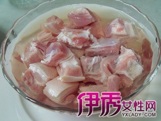2 五花肉切麻将大小的块,冲洗干净后,放一汤匙料酒,浸泡一小时。捞出来沥干。
