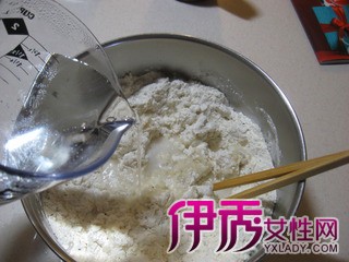 2 水加入面粉里,如果用开水就要用筷子把面粉搅拌一下,然后再用手揉。