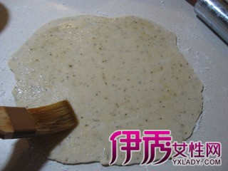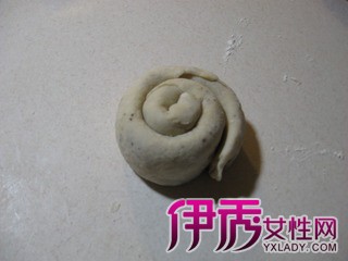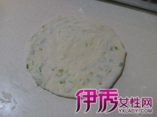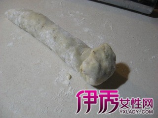 4 取一份用手压扁,用擀面棒擀成圆形(俺的手艺欠佳,不够圆),