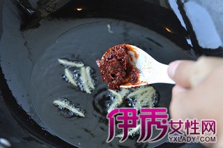 4 调入一汤匙红油豆瓣酱,炒出红油。