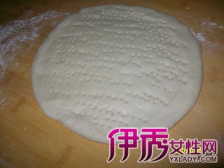 13 发饧好的面团擀成饼状。用叉子叉几个孔