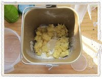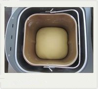 3. 选5甜面包程序,开始搅拌,2:45分取出摔打5分钟,放入桶内倒入玉米油一小瓶盖。 2:20拿出摔打三分钟。放入面包机内松驰30分钟。断电。