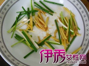 1 原料,一半姜葱切细丝泡水备用(装饰用)。