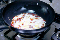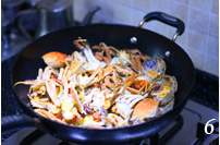 6 等锅中作料颜色变深时,下入剥好的螃蟹下锅翻炒。