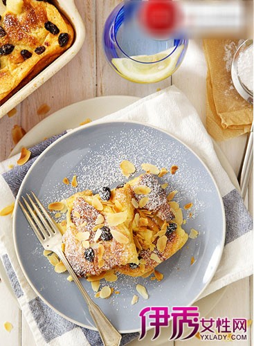 6.再加入剩余的布丁液,筛入肉桂粉,撒上酒浸黑加仑干,烤箱预热,200度,中层,上下火,蒸烤20分钟后撒上杏仁片,继续蒸烤5分钟,出炉筛入糖粉,即可