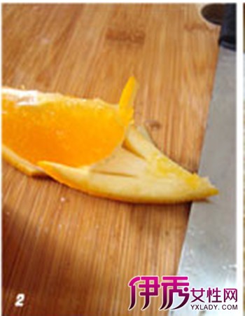 平刀切法将肉与皮分离,尾部留小段不切,用刀尖在皮的左、右侧各斜切一刀。