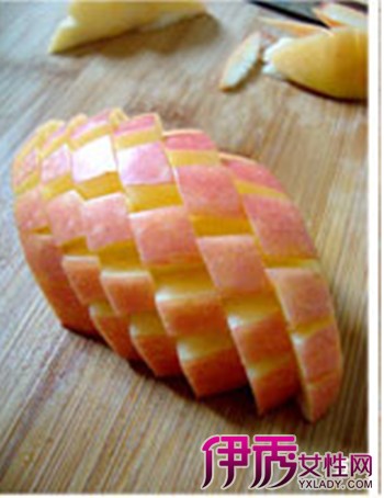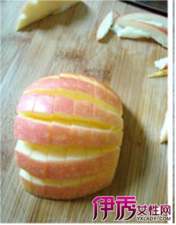 把苹果横过来,切掉两头,切成块状。