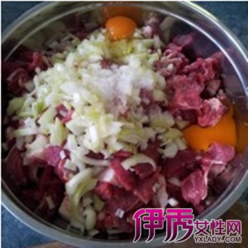 2. 将洋葱切块拌入,加入蛋、盐、料酒搅拌并腌制12小时以上