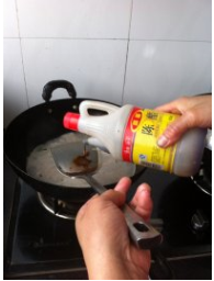 5.加入醋,最好是白醋,家里没有白醋了只能用陈错代替了,这样颜色会不清亮了。