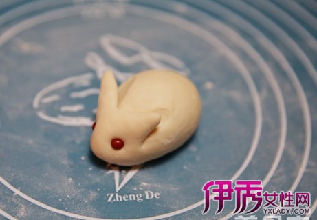 8.在兔子眼睛处赛上两个红豆,小兔子造型做好了