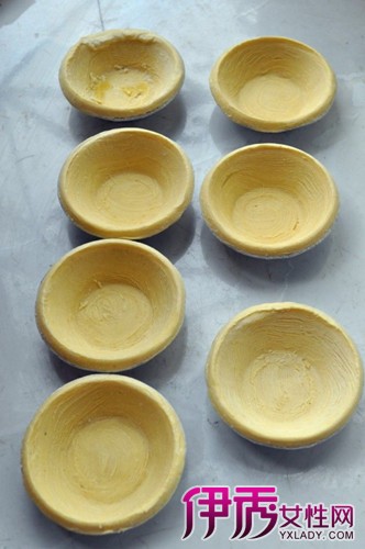 把挞皮放入挞模中,将挞皮按照模具的形状比较均匀地按平,边沿多挤出一点。