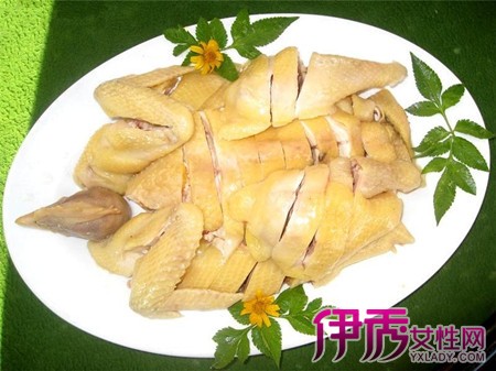 制作流程:①葱、姜切成细丝并与精盐分盛二小蝶,拌匀。用中火烧热炒锅,下油烧至微沸,取出,分别淋在二小碟上,供佐膳用;②将鸡洗净,放水中净煮,中间提出两次,倒出腔中的水,以保持内外温度一致。约浸十五分钟至熟,用铁钩勾起,再放在冷开水中浸没冷却,并洗去绒毛、黄衣,随即捞起。晾干表皮,扫上熟花生油,斩成小块,盛入碟中,摆成鸡形。吃时佐以姜茸、葱丝。