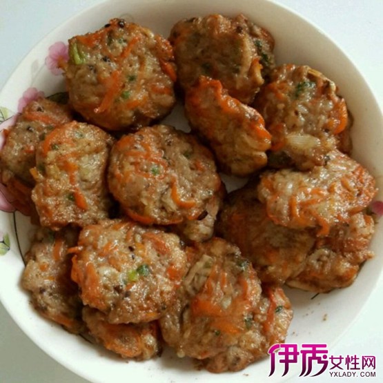 材料: 猪肉馅250克、胡萝卜200克、鸡蛋清1个、料酒1汤匙(15ml)、葱花5克、姜末15克、淀粉3汤匙(45ml)、盐适量、黑胡椒粉少许、鸡精少许