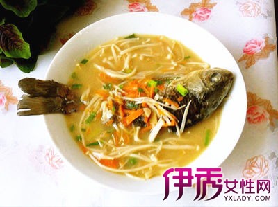材料:条鲫鱼、250克金针菇、10粒枸杞子、若干大葱、小葱、姜