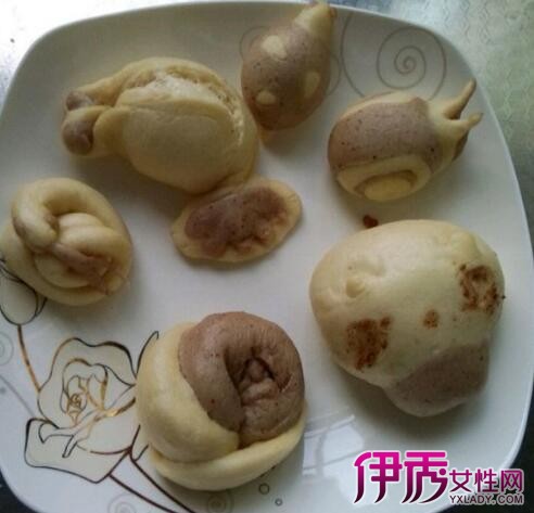 花样面食 1、玫瑰花馒头:(有时在几个面皮间抹点油,加点盐,花椒面什么的,像花卷的味道,也好分层) 2、猪蹄卷:(肉馅越细越好,也可用鸡肉。)