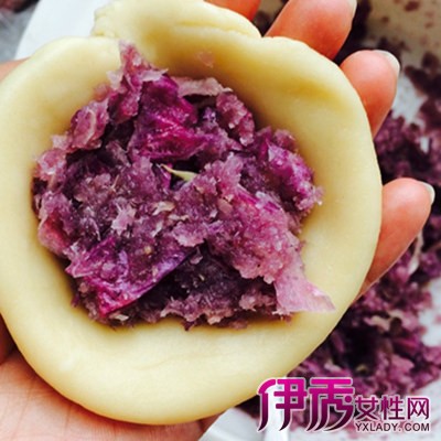 7.水油剂子捏成灯盏窝状,中间放入一个油酥剂子,把口收紧后搓圆。