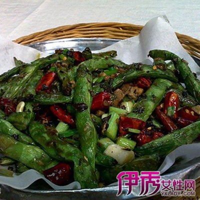 首先准备材料:主料:猪肉100g、四季豆300g。配料:大蒜2瓣、干红辣椒2个。调料:拌饭酱1大勺、糖1茶匙。开始准备步骤:将四季豆洗净后择去两端的筋,然后掰成5-6厘米的段,蒜和红辣椒切碎,肉剁成肉馅;锅中放入适量油,烧热后放入四季豆;小火煸炒至四季豆外皮开始出现皱褶时,盛出沥油;另起锅加入少许底油,烧到7成热时,放入蒜末、辣椒末煸香;放入肉馅,用铲子快速将肉馅划散;调入拌饭酱;将肉馅炒熟后倒入之前煸过的四季豆翻炒几下;再调入白糖,翻炒1分钟,待调料和菜混合均匀后即可。