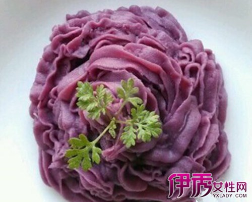 用料材料 用量紫薯 6只小的牛奶 淋一遍碗里紫薯的量沙拉酱 适量生菜 少许1. 紫薯蒸熟后去皮(我是整个扔进放水的电饭锅煮了20?30分钟的样子。看大小、小的煮的时间少一点) 2.去皮后的紫薯倒入食品料里机、淋上牛奶,搅打成泥(没有料理机用勺子手动压成泥,压之前淋上牛奶) 3. 将搅打好的紫薯泥放入裱花袋,用菊花型花嘴裱在装饰用生菜上(生菜可以用别的代替、看你喜欢用什么,我是直接生菜一起吃的) 没有裱花袋和裱花嘴就自己拿勺子挤成型。。什么型就不知道了,你也可以选择直接吃。 4. 最后就可以了,摆好盘再挤些沙拉酱,又好看又好吃紫薯颗粒感较强,一定要处理细致,口感才好。紫薯本身有甜味,加糖要有分寸。