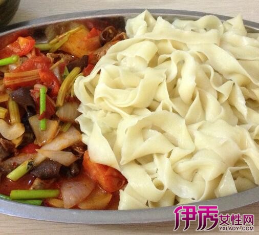 5)锅中再倒入一点儿油,烧热后加入姜末炒香后,放入洋葱,芹菜,白菜,西红柿,木耳,蒜苗,炒至蔬菜变软,西红柿有汤汁流出,加入番茄酱,倒入2汤匙(30ml)的水,炒匀,然后加入盐,生抽,糖,炒半分钟,接着放入炒好的羊肉片、尖椒片、面条,最后淋入米醋,撒上蒜末,炒匀即可盛出。