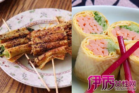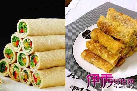 常见的豆皮卷食材,有土豆丝、各种蔬菜、火腿等。但是今天要介绍给大家几种特别的,甚至是只有在饭店里见到的豆皮卷。由于豆制品本身的口味很百搭,因此在豆卷内裹上爽口的蔬菜水果,或是油腻的荤菜肉类,都不会显得违和,甚至能创造出别样新鲜的口感。将芒果、黄瓜切丝凉拌,浇上沙拉酱或番茄酱,条件允许的话放入整只的虾仁,最后裹进豆皮卷里,就是一道色香味俱全的凉菜。