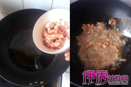 炸鸡肉:取一炒锅,热锅倒入可以没过鸡块的植物油,烧至五、六成热(即筷子放入油锅,筷子周围形成密集的小气泡,无烟),放入鸡块炸三分钟左右,捞出,控干油。大火,将油烧至七成热(即筷子放入油锅,筷子周围形成大量的气泡,有烟),放入鸡块复炸至鸡块变成金黄色,捞出,控干油。