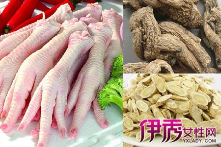 秋冬之际,正是进补时节,如果你是体质虚寒,月经不调的女性,可以尝试吃药膳鸡爪。药膳鸡爪一般采用黄芪、当归、枸杞、红枣等养生药材。黄芪,补气养血,对于体虚内热的人有一定的疗效作用;当归,非常适合女性补血,有益于调节女性经期不调等问题,而枸杞,属性寒性,刚好可以中和当归热燥,起到了调节作用。而药膳中的鸡爪,含有丰富的胶原蛋白,修复皮肤,增加皮肤弹性,防止肌肉松弛。