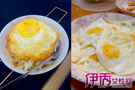 接下来是第二种,材料还是不变,等电饼铛热好后将切成圈的洋葱稍微爆一下,然后将鸡蛋磕进去,这里的鸡蛋蛋清拖一下,让鸡蛋大体成为一种长条形,等鸡蛋煎好后装盘,用番茄酱(或者其他自己喜欢吃的酱)在蛋清上画上鱼骨头的样子,在蛋黄上面点一个眼睛,一条小鱼荷包蛋就做好啦,相信有宝宝的妈妈或许可以用这种方法勾起宝宝的食欲哟。