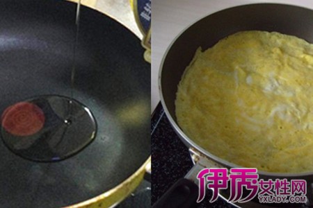 二:在平锅里倒入两勺油,加热后倒入打匀的蛋液,平铺在锅底,调至小火;