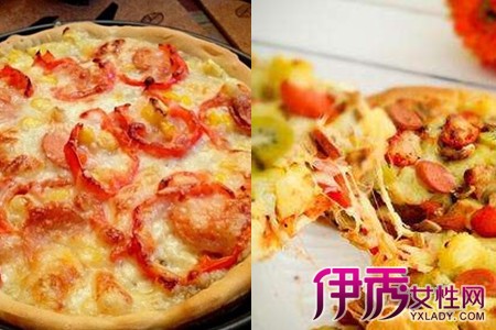 首先将水果和火腿肠切好备用,把面粉都倒入盆中搅拌一下,再加入酵母粉和白糖,搅拌均匀;缓缓加入104克温水揉成光滑的面团,加入黄油,将面团揉捏至完全吸好油为止,用保鲜膜封好,待发酵至原来面团的两倍大时就可以取出,再次揉捏1分钟左右,静置,醒面15分钟。接下来就可以将披萨盘洗净、擦干、均匀涂上油,将面团擀成披萨盘大小的面饼,铺在披萨盘上,用小叉子在面饼上戳上几个小洞,防止烘焙会鼓起,放入烤箱用180度烤10分钟。取出后涂上色拉油,把准备好的水果和香肠摆放于披萨上,铺上芝士,放入烤箱用200度烤18分钟左右即可。【女物原创未经允许,谢绝转载!】