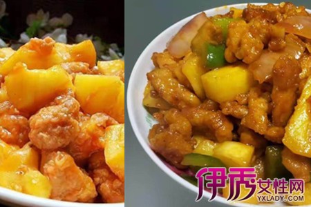 菠萝咕噜肉准备材料:五花肉 菠萝 青红灯笼椒 玉米淀粉 鸡蛋 番茄 醋 白糖做法:菠萝洗干净切成小块,用淡盐水浸泡,青红灯笼椒去籽切小块,番茄切块,肉洗干净切块后用盐、鸡蛋和料酒腌15分钟,腌制好的五花肉均匀地滚上玉米淀粉,锅内倒入适量的油,加热后放入五花肉炸成金黄色捞出,再翻炸一遍后出锅。烧热的锅内放油,放菠萝番茄翻炒,加入番茄酱、醋、白糖和少许清水。放入炸好的五花肉和青红灯笼椒翻炒,加入淀粉水勾芡,再翻炒一会就可以加盐出锅了。
