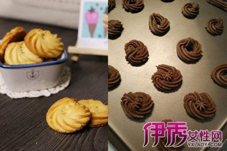 接下来还有几点做曲奇的小窍门得提点一下,第一,打发黄油时要完全打法,切勿用植物黄油,因为这样做出来的曲奇口感不好。第二,属于粉类的材料一定要经过筛,不然会结块的。第三,面团得要硬的不能添加太多的牛奶,你也可以不加牛奶,不然烤出来的曲奇会没有形状。第四,在裱花之前得把袋中的面糊挤压在最前面,中间不能留空隙,因为这样不容易造型。第五,烘培时间不可以太过长间,用为太长时间会焦,或者太黄而影响曲奇的样色。【女物原创未经许可,谢绝转载!】