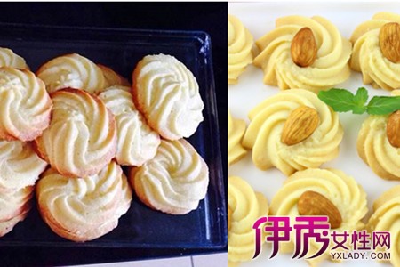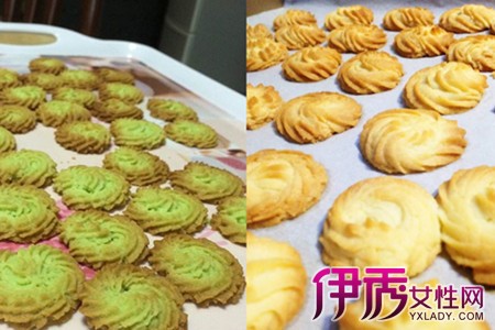 将面粉和低筋面粉混合,然后用小筛子过筛后加入到打发好的黄油中。用抄拌的手法,由下往上抄拌均匀。裱花袋装上裱花嘴。如果做原味曲奇饼干,直接把拌匀的面糊加入裱花袋就行了。要是做其他口味的曲奇饼干,在装进裱花袋之前,往里面加入抹茶粉或者可可粉,要是做蔓越莓口味的需要事先用朗姆酒将蔓越莓泡软,并且将蔓越莓打碎。蔓越莓一定要打到很碎,不然会堵塞裱花嘴,也会影响曲奇的纹理。烤盘铺上厨房纸,挤出自己喜欢的花纹后,烤箱180度预热,烤大约十分钟。美味就这样完成了!【女物原创未经允许,谢绝转载!】