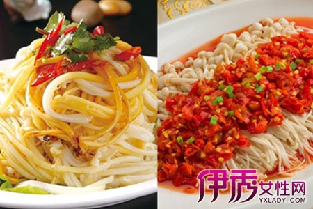如果您是凉拌菜的爱好者,那么金针菇这种食材可千万别错过。焯水煮熟的金针菇加入盐、油、醋、蒜等简单的佐料便立即变身成一道酸爽可口的经典美味,特别是在炎热的天气里,吃上一口便觉得清凉舒坦。如果在拌制时加入适量的黄瓜丝、青红椒丝,这道菜会更加色彩斑斓,激发出每位食客的食欲。喜欢辣口的朋友一定会对剁椒金针菇念念不忘,与凉拌不同,这道菜的金针菇需要上锅蒸熟,最重要的是要浇上红彤彤的剁椒酱,那配色甭提有多诱人了。在制作时需要特别注意,不管是拌还是蒸,一定要将金针菇彻底加热做熟。