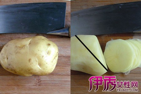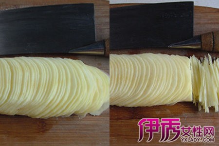 首先,需要准备的只是两个土豆,大概就是一到两个人的分量了,还有就是一把有整体大小均匀的刀片的菜刀,方便操作,还可以保证土豆片切得比较均匀。将土豆皮用刀片或者其他去皮工具进行去除,在土豆上,菜刀大概呈30度左右的方向进行切片,就像上一张图的黑线所示。将土豆切好片之后,如上图一样,将土豆片排开,顺着方向进行切丝,十分迅速并且好看。