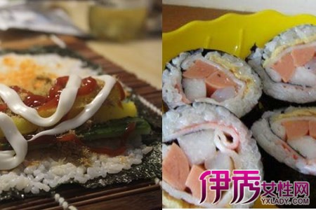 将米饭盛到饭碗中,加入适量的寿司醋,盐和适量的糖,搅拌至稀松状,在卷帘上铺上一张保鲜膜,用米饭将卷帘铺满,注意四周留下一点空隙,防止卷的过程饭漏掉,铺平压紧,先涂上一层沙拉酱依次放好芝士,蟹柳,黄瓜,火腿,还有肉松,利用卷帘将其卷起,注意不要把保鲜膜卷上,放好,用小刀切成块状。喜欢鱼子酱的小伙伴可以在上面撒上一层鱼子酱,颜值也可以加上一成。或者可以用鲜虾煮熟弄成一整条,放在米饭上面。【女物原创未经允许,谢绝转载!】