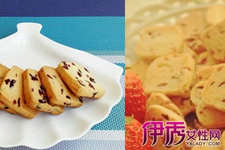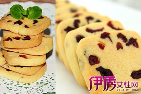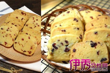 首先要把黄油加热融化,加入白糖搅拌均匀;接着把把鸡蛋的蛋黄加进去继续搅拌,再把蔓越莓干切碎,同样倒进碗里,使劲搅拌均匀;就可以加入准备好的低筋面粉搅拌。使之成为表面光滑的面团,然后用手稍微调整一下面团,把它弄成宽5cm、高3cm的方体,放进冰箱冷冻一小时左右,使饼干更好地成型;接着把冻好的面块拿出来等一会,就可以用刀把它切成厚度适中的片状,然后整齐的铺在烤盘上;再把烤箱预热,把饼干放入烤箱中,温度调至165°,大约25分钟后,看到饼干表面变成金黄色即可端出,这样,松软可口的蔓越莓饼干就做好了。【女物原创未经允许,谢绝转载!】